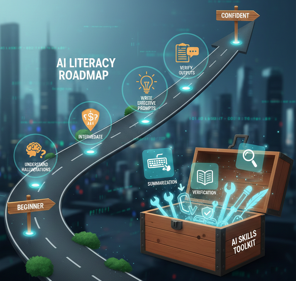 Ultimately, the key skill is AI literacy. Knowing how to communicate with AI tools, evaluate their responses, and integrate them into your workflow. You don’t need to become an expert overnight. Build good habits, write clear prompts, stay aware of hallucinations, and verify anything important.